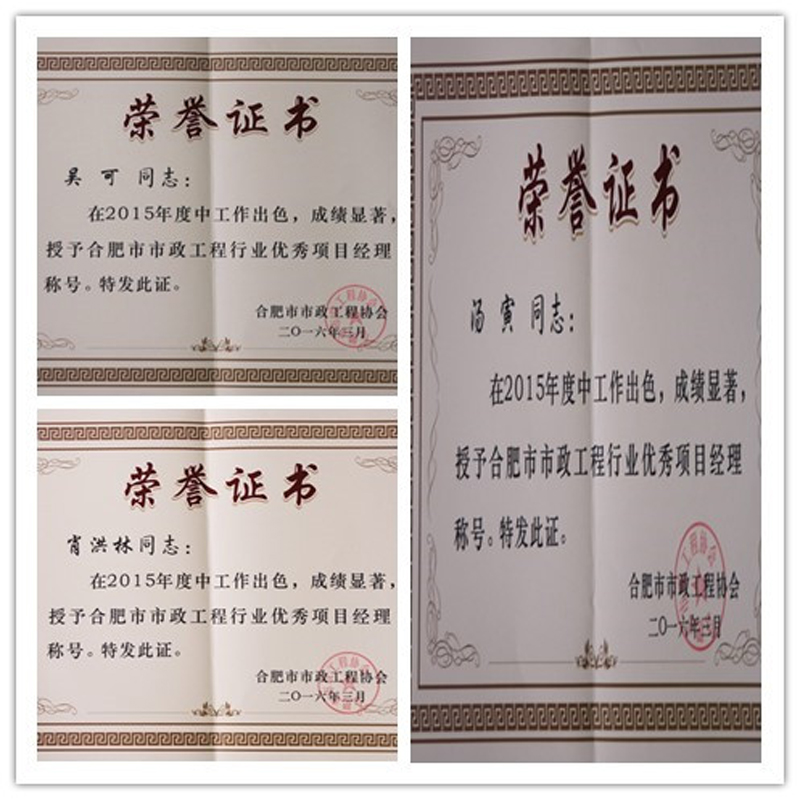 3月31日,合肥市市政工程协会第三届三次理事会大会在庐江县汤池镇举行。会上,对市政工程协会2015年度的工作作了总结表彰,华力建设被评为“合肥市市政工程行业优秀企业”称号,建造师汤寅、肖洪林、吴可被授予“优秀项目经理”称号。