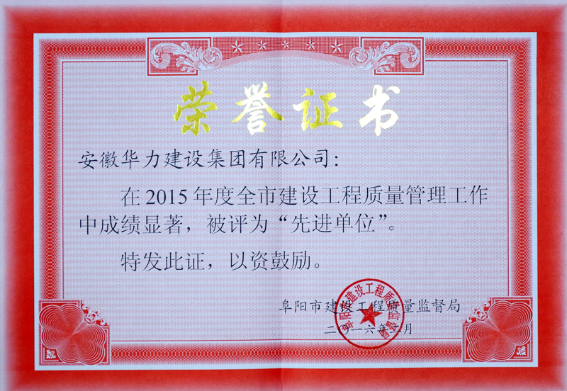 华力建设荣获阜阳市“建设工程质量管理工作先进单位”