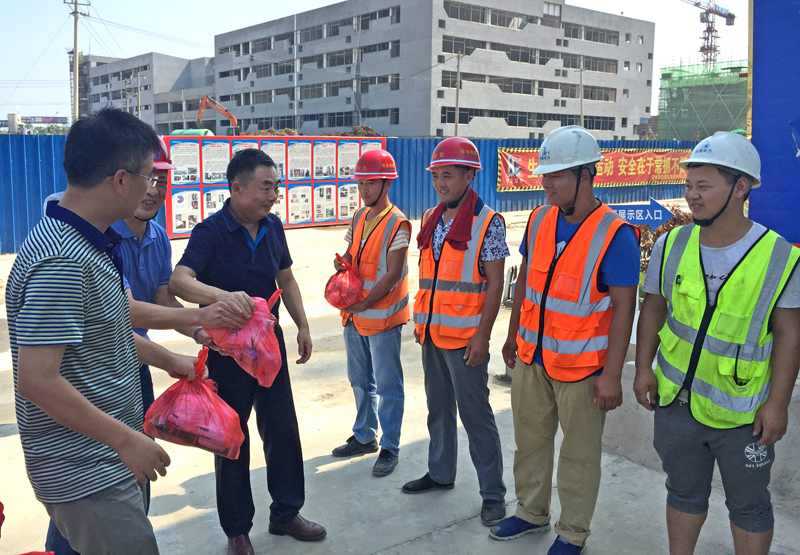 在施工现场,项目负责人邵山向桑主任一行表示衷心的感谢,并汇报了总体工程进展和项目部防暑降温措施,桑林兵主任都对项目人员和建筑工人们表示了亲切的慰问,并要求项目管理人员坚持“以人为本”、“安全第一”的理念,努力改善工作环境,调整施工作业时间,避开中午高温时间段施工,合理安排夏季施工作业计划,提高防范意识,确保建设工程施工安全与职工身体健康两不误。