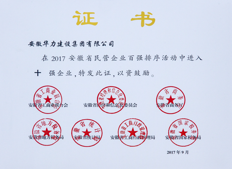 华力集团荣膺“2017安徽省民营企业百强排序10强企业”