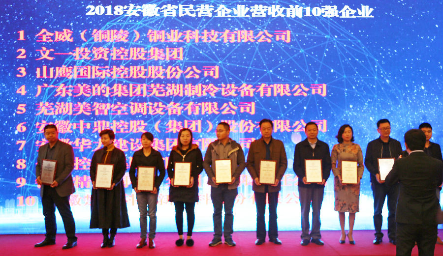 发布会公布了民营企业营收百强、纳税百强、进出口百强名单,并分别向前20强民营企业代表授牌。安徽华力建设集团荣登民营企业营收百强第7名,较2017年上升1位;同时安徽华力建设集团还荣获民营企业纳税百强。