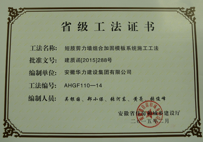 近日,建设公司从省住建厅领取了《短肢剪力墙组合加固模板系统施工工法》、《基础底板后浇带轻型降水井点多重防水封堵施工工法》粉砂土质边坡组合式支护施工工法》等独立或联合开发八项省级施工工法。这八项省级工法的获得,不仅是华力建设科技研发水平的体现,更是先进施工方法的积累,有利于公司不断提高技术竞争力,打造质量标杆,提升公司品牌形象。