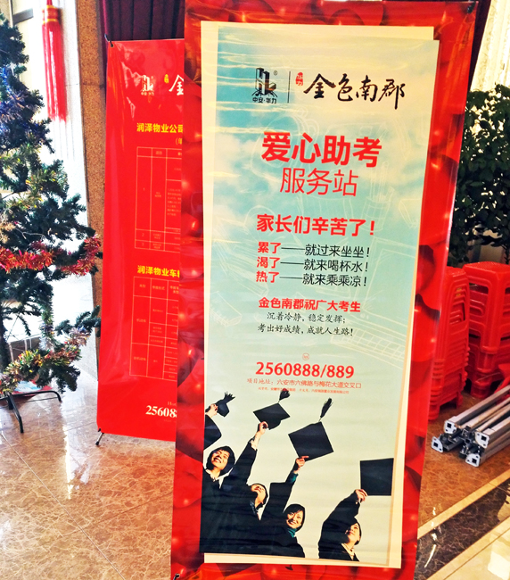 7日、8日的高考大战,项目部工作人员早早的到达裕安区九中考点,将准备好的矿泉水和扇子,送到考生和家长的手中,在考场外搭起休息室,让辛苦送考的家长坐一坐、凉一凉。他们也给各个路口辛苦执勤的交警,送去矿泉水的。金色南郡贴心、服务、人性化的形象得到了得到了考生及家长的高度赞扬。