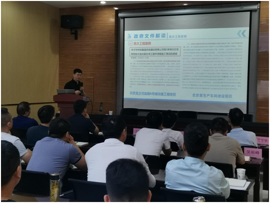 集团副总工程师卫世全针对危险性较大的分部分项工程安全管理、专项方案的编制及论证等重点内容逐一进行讲解。培训会上首先结合工程实际对住建部37号令和31号文进行了全面解读,接着重点对危大工程的管理流程、方案设计、检查要点等内容进行了剖析。最后通过案例分析,警示教育各级工程技术、安全管理人员,加强专项施工方案编制、报批、执行的过程管理,切实履行岗位职责。同时强调,施组和方案是项目施工组织管理工作的核心和灵魂,只有做到编制、审批、论证、实施、监测、验收的“六到位”,才能保证施工的安全性、可靠性。另外,技术质量部张靖对近期发布的《施工组织设计与施工方案分级管理和审批规定》进行了宣贯。