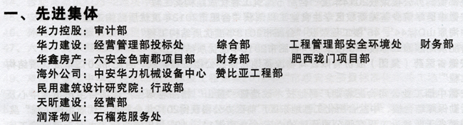 2015年1月31日,安徽华力建设集团2012-2014年度总结表彰暨安徽省民用建筑设计研究院有限公司晋升甲级资质庆祝大会在稻香楼宾馆隆重举行。会上通报表彰了一批先进单位、先进个人。