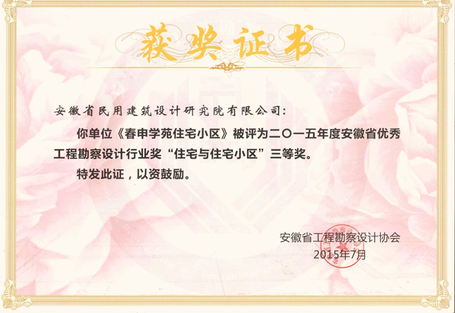 日前,从安徽省工程勘察设计协会获悉,刚刚公布的 2015年度安徽省优秀工程勘察设计行业奖”获奖项目名单中,安徽省民用建筑设计研究院有限公司榜上有名,该院设计的《寿县春申学苑住宅小区》荣获“住宅与小区”奖项三等奖。
