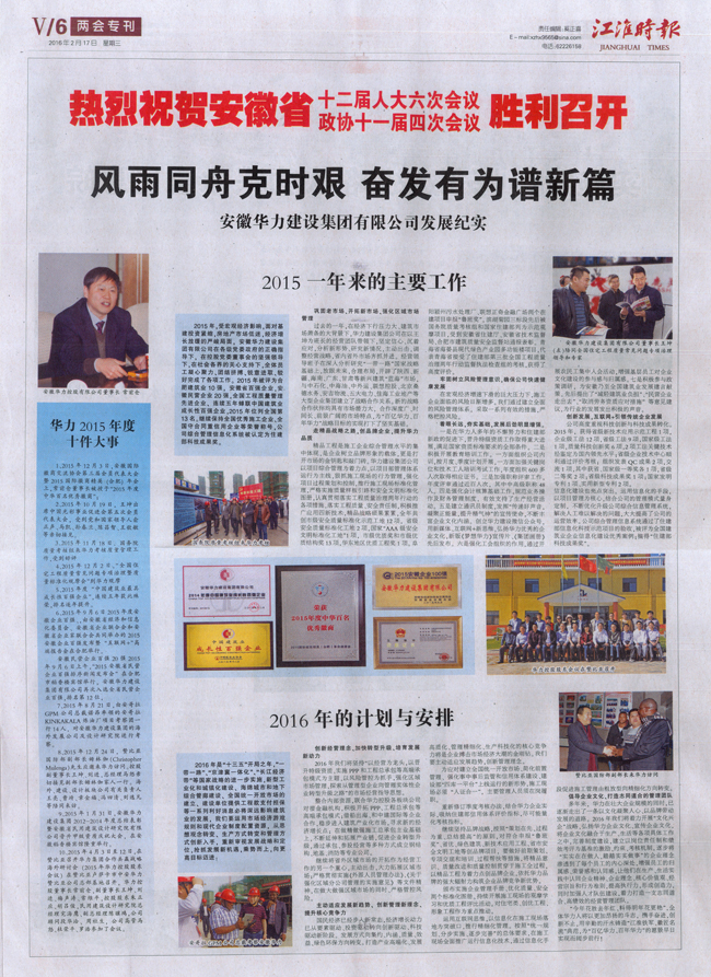 会议期间,《江淮时报》以整版的篇幅,以“风雨同舟克时艰 奋发有为谱新篇”为题,报道了华力集团2015年所取得的成就,以及2016年目标计划。