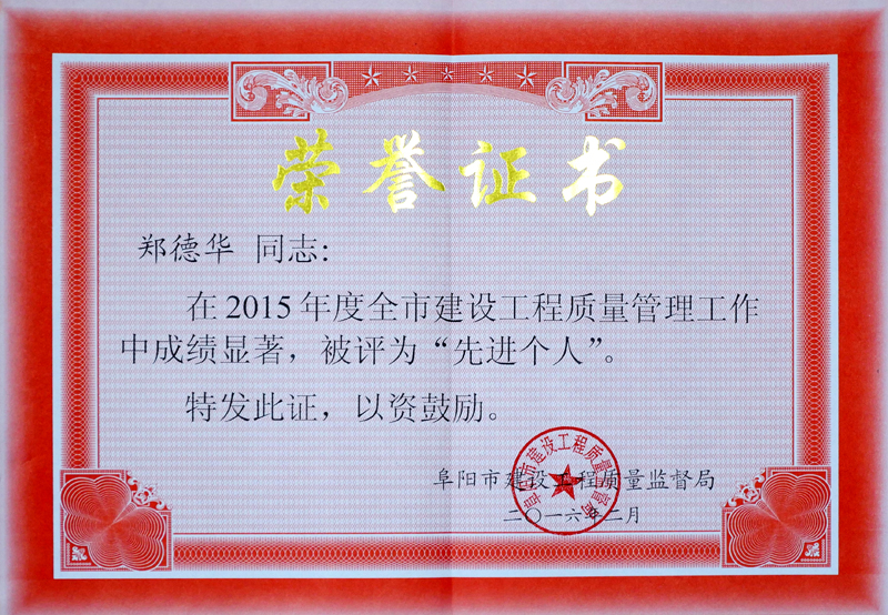 日前,阜阳市建设工程质量监督局发文《关于表彰2015年度全市建设工程质量管理工作先进单位和先进个人的通知》(阜建监〔201619号),通报表彰在2015年工程质量监督管理、工程质量标准化建设和工程质量治理两年行动工作中取得显著的成绩的20家先进单位及47名先进个人。安徽华力建设集团有限公司获得先进单位,阜合家园三期项目部郑德华、临泉辉隆大市场项目部琚向东获得先进个人,是受表彰的施工单位中人数最多的一家。