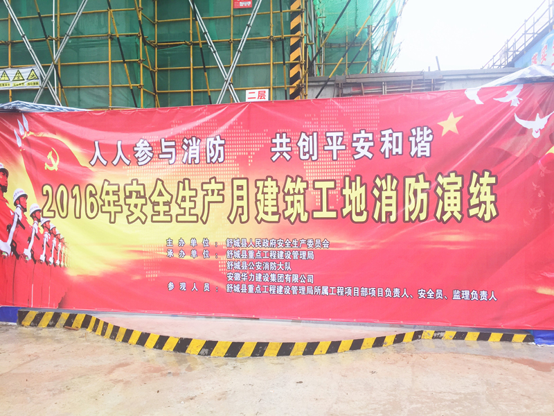 2016年6月25日上午9时,由舒城县人民政府安全生产委员会主办,舒城县重点工程建设管理局、舒城县公安消防大队、安徽华力建设集团有限公司承办的《2016年安全生产月建筑工地消防演练》活动在舒城县紫荆园二期工地现场顺利举行。