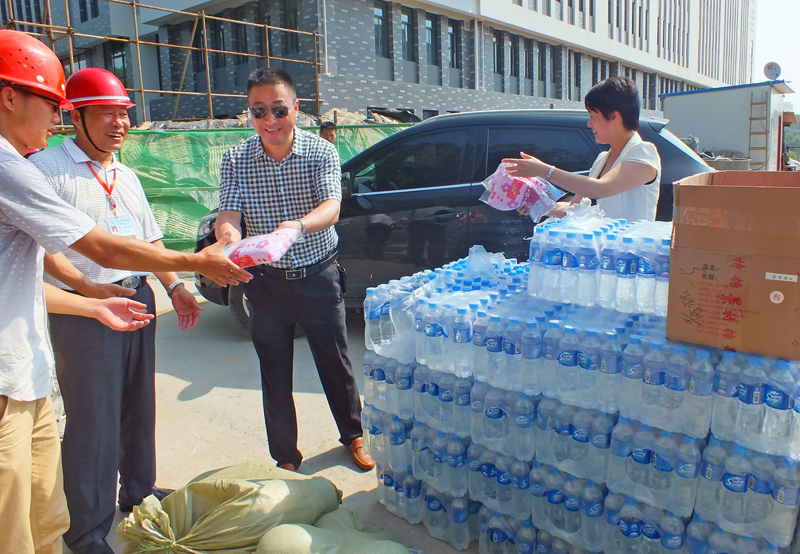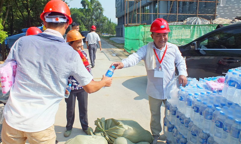 重点局党组书记项永锋给工人递上矿泉水等降温品