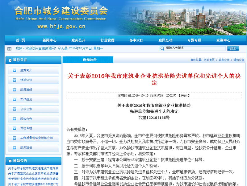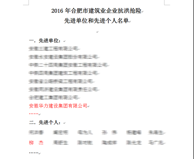 日前,从合肥市城乡建设委员会获悉,市建委发文《关于表彰2016年我市建筑业企业抗洪抢险先进单位和先进个人的决定》,表彰安徽华力建设集团有限公司等48家单位为“抗洪抢险先进单位”,华力项目负责人柳杰等43人“抗洪抢险先进个人”。
