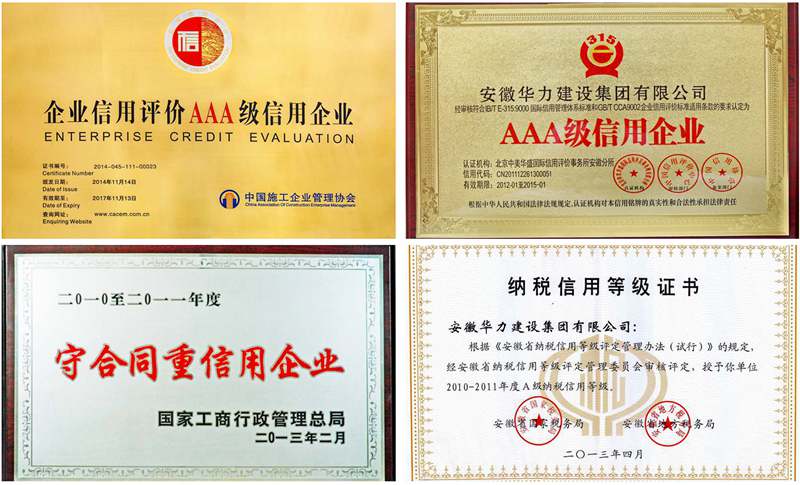 安徽华力建设集团有限公司与安徽省天昕市政工程有限公司荣获首批“安徽省信用企业”;华力集团先后被评为“全国守合同重信用企业”、“银行授信AAA级企业”、“安徽省纳税信誉A 级单位”、“全国建筑业AAA级信用企业”。