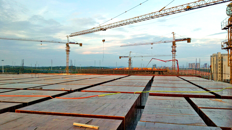 该项目施工工期紧,在进入施工现场后即开始下雨,基础施工阶段3月份实际具备施工天气仅5天,4月份更是雨天连连,至5月3日完成基础施工,实际施工天数仅花费25天。由于工期紧,结构跨度大,模板及内架不能及时拆除用于周转,必须准备2套模板及2层内架。每层建筑面积约2.3万平米,脚手架钢管需要110万米,每断面施工钢筋用量达240吨,混凝土连续浇筑达1400立方,这对材料组织、施工连续性带来极高的难度。面对如此庞大困难的工程体量,华力建设克服困难,在短期内组织达600人,每层划为5个施工段,确保了工程顺利推进。
