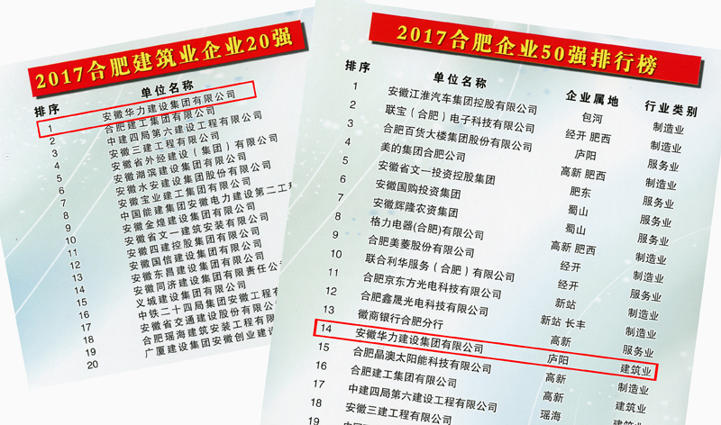 2017年10月17日,合肥市经信委和合肥市企业联合会在合肥召开发布会,表彰2017年度合肥50强企业,同期发布的还有合肥制造业30强、合肥建筑业20强、合肥服务业20强。安徽华力建设集团荣获“2017年度合肥市企业50强”第14名以及“合肥建筑业20强”第1名称号。
