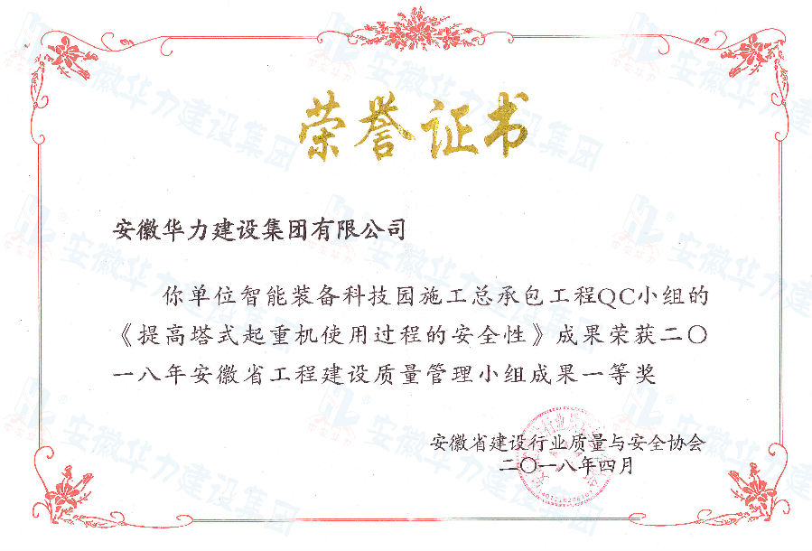 “明珠路西延工程”QC小组“提高高架桥钢筋砼防撞护栏的外观质量”成果,在中国市政工程协会举办的2018年度全国市政工程建设优秀QC小组活动成果发布会上,荣获“全国市政工程建设先进质量管理小组”称号;“提高钢筋砼防撞护栏的外观质量”成果获得“国家级市政优秀奖”;已建成投用的合肥168中学体育馆,现作为安徽省首例采用隔震技术的项目,应用的“提高钢筋砼防撞护栏的外观质量”成果荣获“国家级市政优秀奖”;“合肥智能装备科技园”QC小组“提高塔式起重机使用过程的安全性”成果、“悬挑式脚手架搭设的质量控制”成果,“中外物流中心项目”QC小组“提高大面积混凝土地坪一次性摊铺”成果分别斩获市级一、二、三等奖。