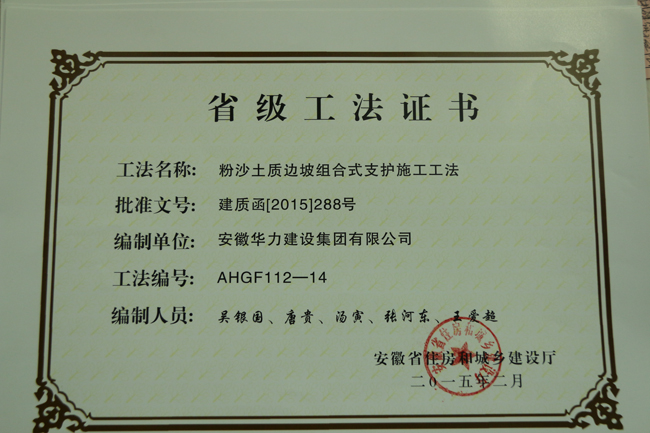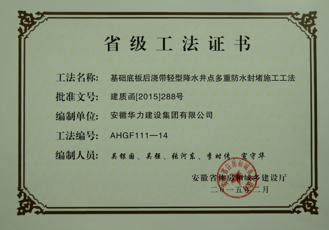 近日,建设公司从省住建厅领取了《短肢剪力墙组合加固模板系统施工工法》、《基础底板后浇带轻型降水井点多重防水封堵施工工法》粉砂土质边坡组合式支护施工工法》等独立或联合开发八项省级施工工法。这八项省级工法的获得,不仅是华力建设科技研发水平的体现,更是先进施工方法的积累,有利于公司不断提高技术竞争力,打造质量标杆,提升公司品牌形象。
