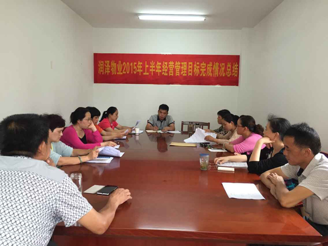 7月10日下午,润泽物业公司2015年上半年度经营管理目标完成情况总结会在舒城玫瑰苑会议室召开,会议由公司总经理张国庆主持,各部门、服务处管理人员参加了此次会议。