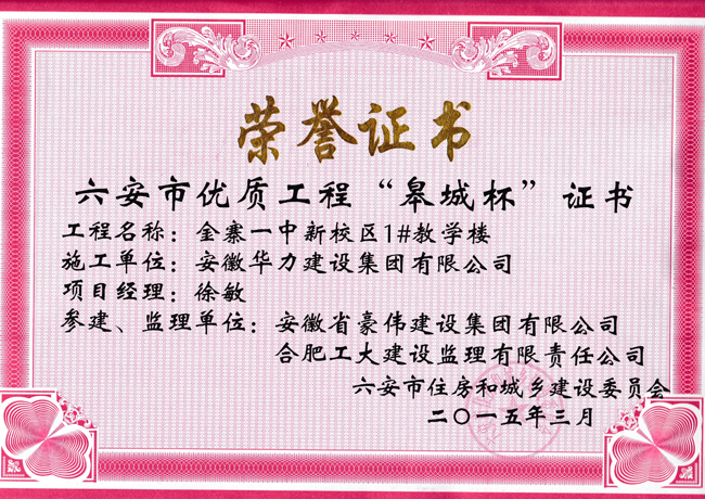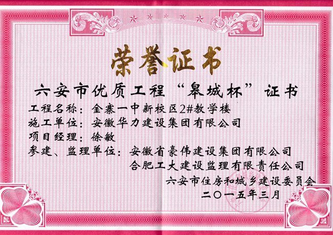 322六安市住房和城乡建设委员会召开的“全市建筑业工作会议”上获悉,2014年度六安市共评选“皋城杯”46项,其中华力建设公司的舒城县城市规划展示中心工程、金寨县一中1#楼、金寨一中2#楼工程、河西星光大道市政工程分别获得“皋城杯”的荣誉。