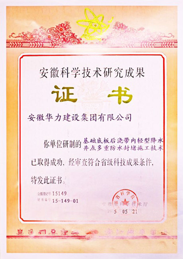 日前,安徽省科技厅给华力建设颁发了“安徽省科学技术成果”奖证书。通过对华力申报的“基础底板后浇带内轻型降水井点多重防水封堵施工技术”组织专家进行审查,专家组认为:该项技术达到国内领先水平,符合省级科技成果条件。