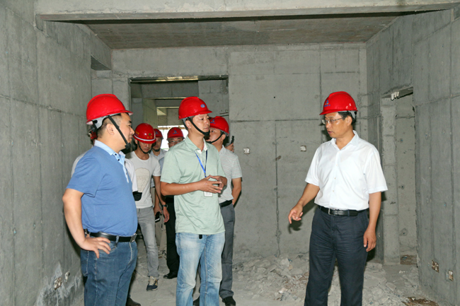韦建华局长(前排中)在夏明军主任(右)、王坤(前排左)陪同下在检查施工现场