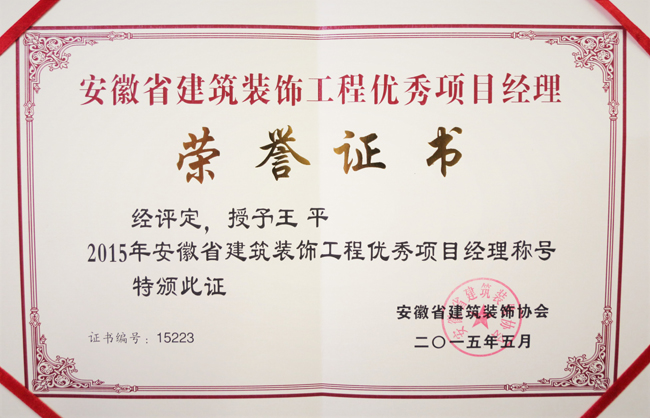 建造师王平“优秀装饰项目经理”证书
