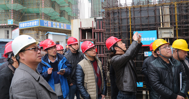 1212下午,芜湖县城乡规划建设委员组织全县施工企业及在建工程的外地企业项目负责人,在县建设委员会副主任兼建设工程质量安全监督站站长钱嗣旺的带领下,在到华力建设施工的滨湖菊园项目部观摩学习,华力建设总支书记王田青陪同观摩。