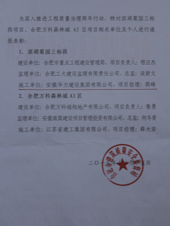 通报指出:12月2日,住建部住宅工程质量常见问题专项治理观摩会在我市召开,会议组织了全国多个省市同行观摩了安徽华力建设集团有限公司承建的滨湖菊园三标段及合肥万科森林城A3区项目,两项目在住工程质量控制和施工质量管理标准化方面的经验和做法得到了住建部、省厅领导及全国各地同行的一致好评。