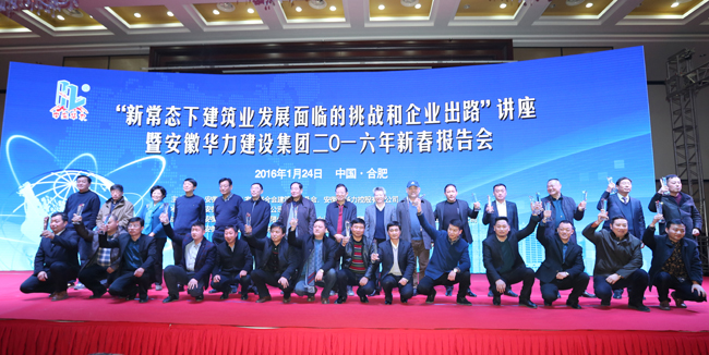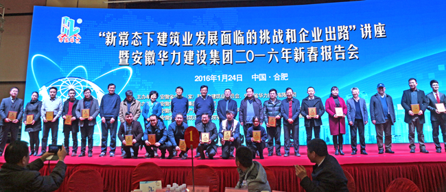 2016年元月24日,由安徽省企业(家)联合会建筑业委员会、安徽省华力控股有限公司主办,安徽华力建设集团有限公司承办的“'新常态下建筑业发展面临的挑战和企业出路'讲座暨安徽华力建设集团2016年新春报告会”在合肥隆重举行。会议第二部分是华力集团总结表彰大会。会上,民用建筑设计研究院完海鹰总经理、华力建设王亮总经理代表子公司对2015年的工作进行了总结,对2016年的工作进行了展望,控股副董事长常维平、党委副书记宣读安徽省华力控股有限公司表彰决定,并对先进集体、先进个人优秀党团员进行了颁奖,控股副董事长,建设板块董事长王坤代表控股作了报告,华力控股常前仓董事长同与会的领导、企业家代表及全体员工分享了《让更多的企业家一起成长》的报告,最后省企业家联合会名誉会长吴昌期作了重要讲话。